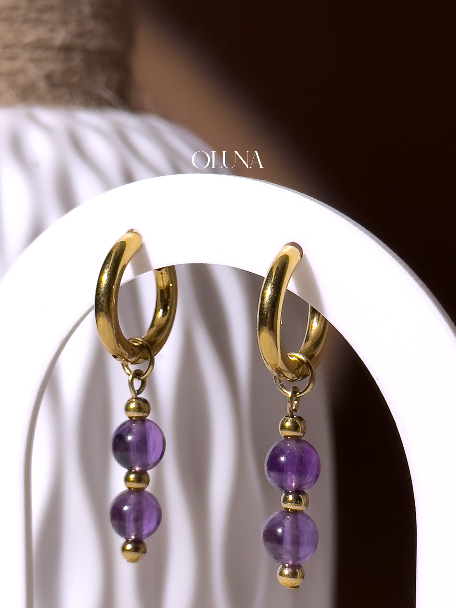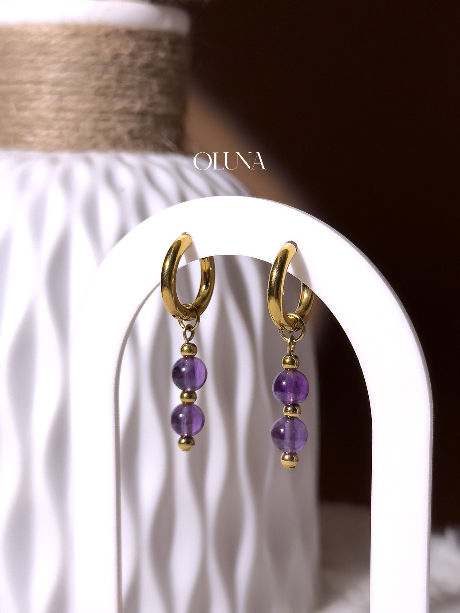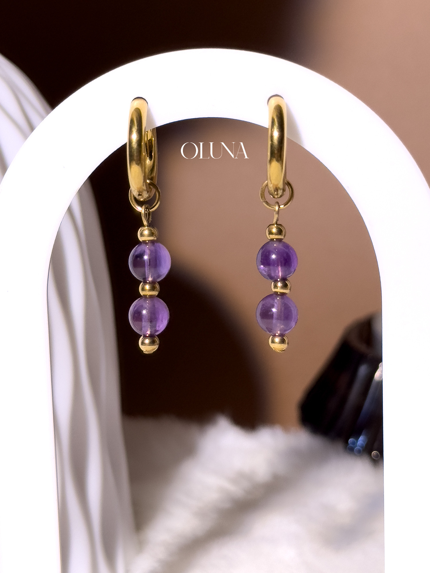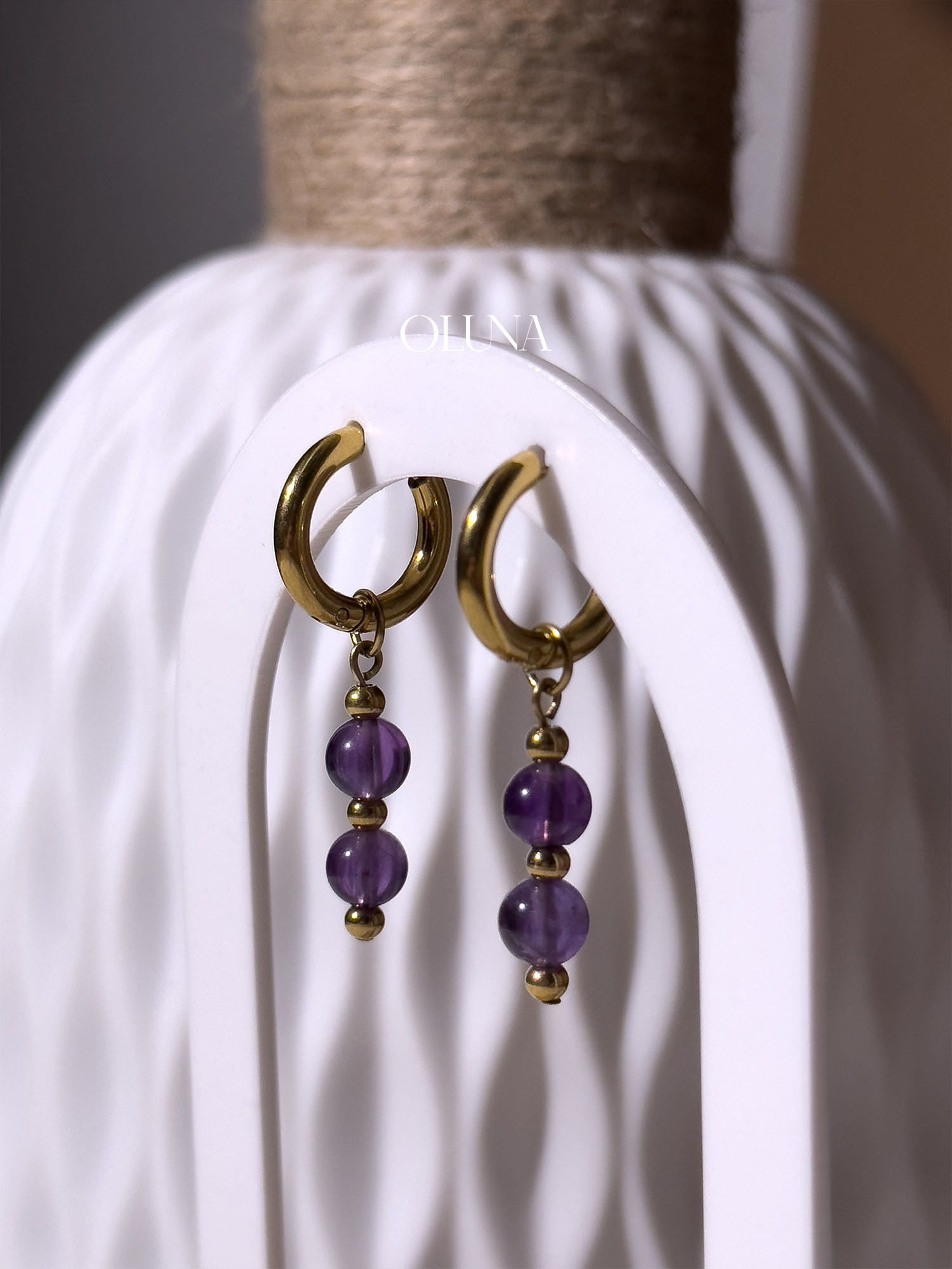 Les créoles Améthyste Julia protègent l’esprit tout en sublimant votre allure. Leur double perle équilibre les émotions et apaise les tensions mentales.