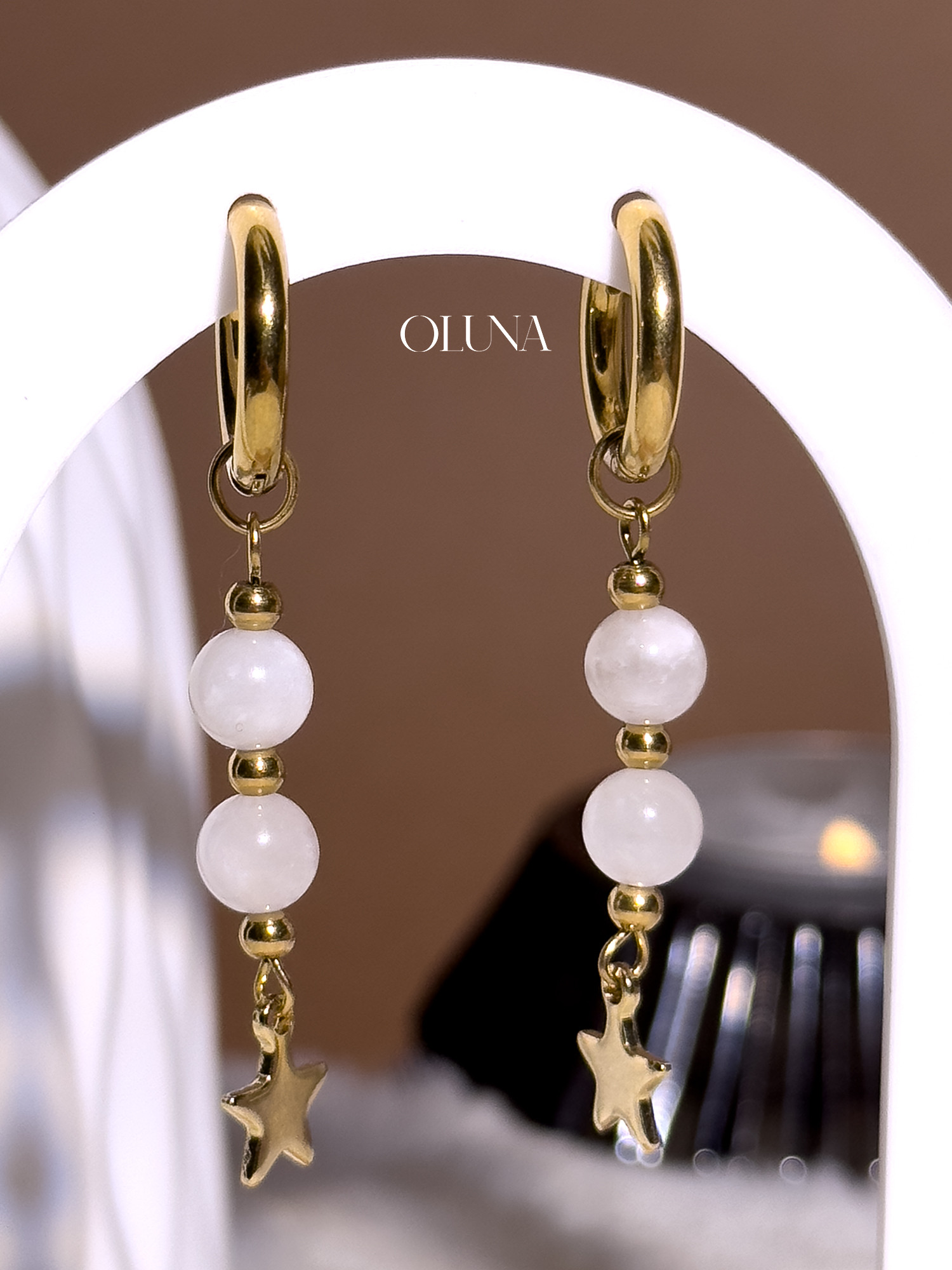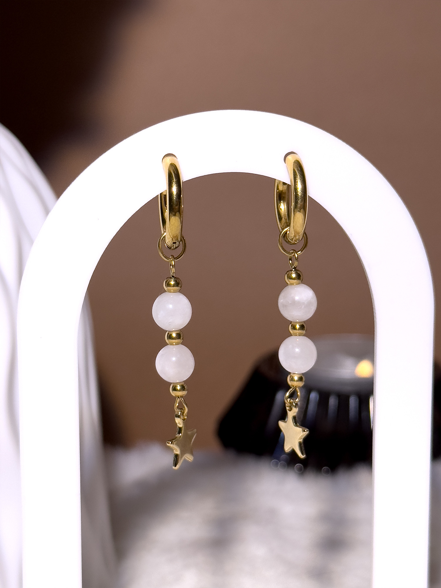 Les créoles Pierre de Lune Nora révèlent la douceur, l’intuition et la féminité profonde. Un bijou fait main chargé d’énergies lunaires, parfait pour équilibrer les émotions.